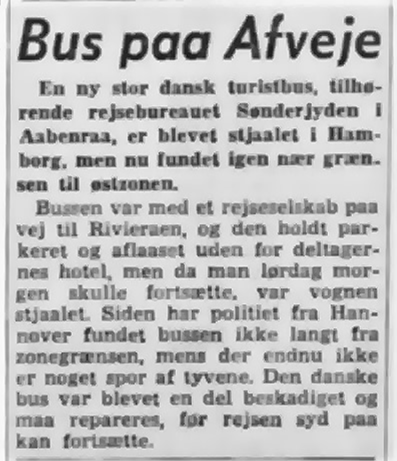 Valuta tyveriet var dog i den billige ende når alt kommer til alt. Værre var det da et rejseselskab i en bus fra Sønderjyden i Aabenrå mistede bussen efter en overnatning i Hamborg. Bussen var klar til afgang, men tyvene havde hugget bussen, som dog blev genfundet nær zonegrænsen til Østtyskland af den tyske politis afdeling i Hannover. Bussen måtte dog repareres før selskabets rejse mod Rivieraen kunne fortsætte.