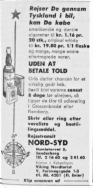 To sjove annoncer med toldfrie tilbud til bilister på vej sydover. Billige cigaretter og whisky er de store trækplaster. 1,16 kr. for 20 cigaretter svarer til ca. 16 kr. i dag.