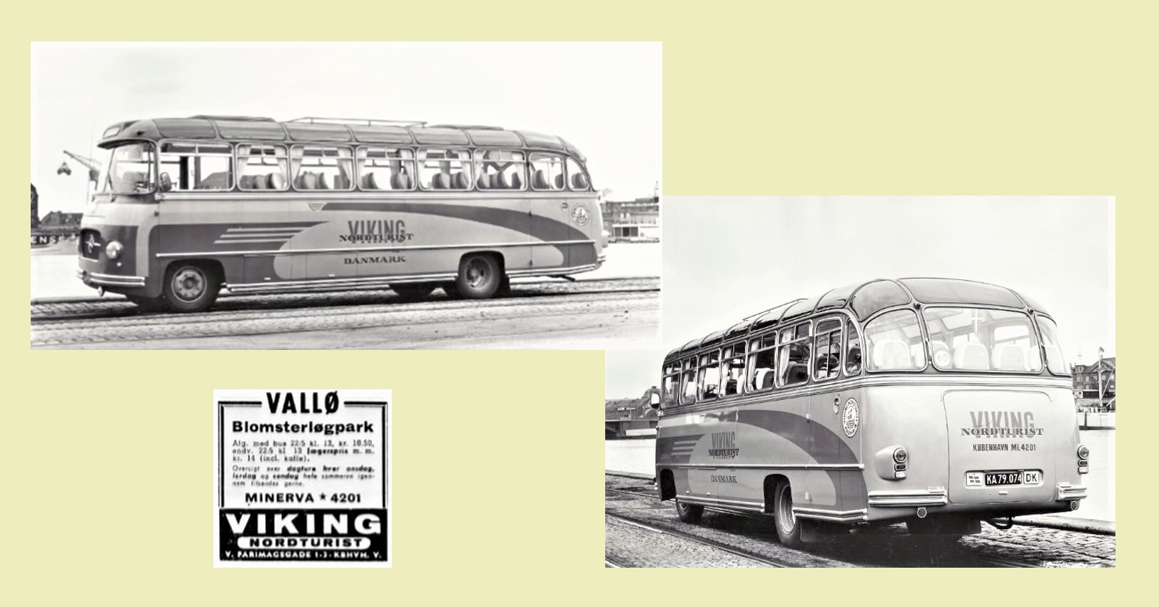 Nedenfor: To flotte Viking Nordturist busser fotograferet omkring 1960 og en samtidig annonce for en af Viking Nordturists altid populære dagture.