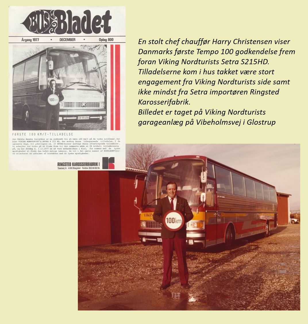Viking Nordturist søger nemlig, som den første danske vognmand, de tyske myndigheder i Kiel om, at netop denne bustype får tilladelse til at køre 100 km/t på de tyske motorveje, på lige fod med de tyske busser, selvom den er indregistreret i Danmark. Efter en del samtaler mellem Leif L. Hansen Viking Nordturist, Setra importøren Ringsted Karosserifabrik og de tyske myndigheder, lykkes det i efteråret 1977 at opnå denne Tempo 100 tilladelse. Stor er glæden, og tilladelsen foreviges med den stolte chefchauffør Harry Christensen foran den nye bus, bærende det dengang officielle Tempo 100 skilt. Billedet, som ses ovenfor, er i øvrigt taget på Viking Nordturists daværende garageanlæg for enden af Vibeholmsvej i Glostrup. Tilladelsen kommer i øvrigt efterfølgende til at gælde alle dansk indregistrerede Setra Serie 200 busser.
