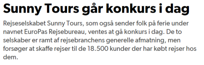 Sunny Tours af 1998 og EuroPas Rejsebureau, der har samme adresse på V. Farimagsgade 1 i København som Sunny Tours, meddelte Rejsegarantifonden, at de ikke har mulighed for at fortsætte deres virksomhed.’