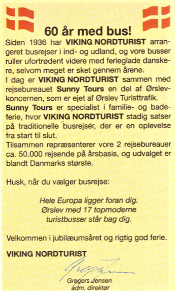 I et vedlagt velkomstbrev til Viking gæsterne gør Gregers Jensen en dyd ud af Viking Nordturists 60 årige erfaring med at arrangere busrejser i Europa til konkurrencedygtige priser, og at bureauet er ’still going strong’. Samtidigt udvides nettet af påstigningssteder så mange af gæsterne kan begynde deres rejse i Roskilde, Slagelse, Ringsted, Næstved og Tappernøje, uden at gæsterne fra København skal fragtes ud over hele Sjælland på vej sydover.