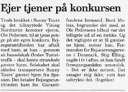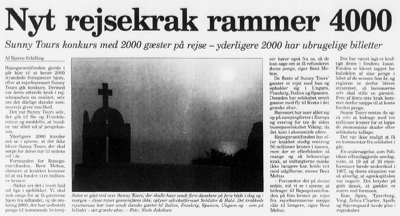 I september samme år skriver Politiken følgende om Sunny Tours krakket: ” Som sagen fremstår nu, ser det ud til at Sunny Tours’ moderselskab, Ørslev Turistfart, tømte alle likvider ud af Sunny Tours i efteråret 1997″ og man antyder i artiklen, at især et salg af værdierne i Sunny Tours (en række udlejningstelte på sydens destinationer) blev solgt af moderselskabet (ØT) til Sunny Tours, med henblik på at overføre de sidste likvider fra Sunny Tours til Ørslev Turisttrafik”.