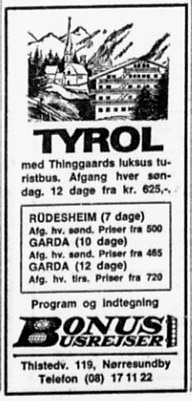 Til højre ses en annonce fra Bonus Busrejser sommeren 1970. Bonus Busrejser havde samme adresse som Thinggaard, så hvorvidt dette bureau i realiteten er forløberen for Thinggaard busrejser kunne man ane. Til gengæld er det vitterligt, at selskabet brugte Thingaards luksusturistbusser til turene.