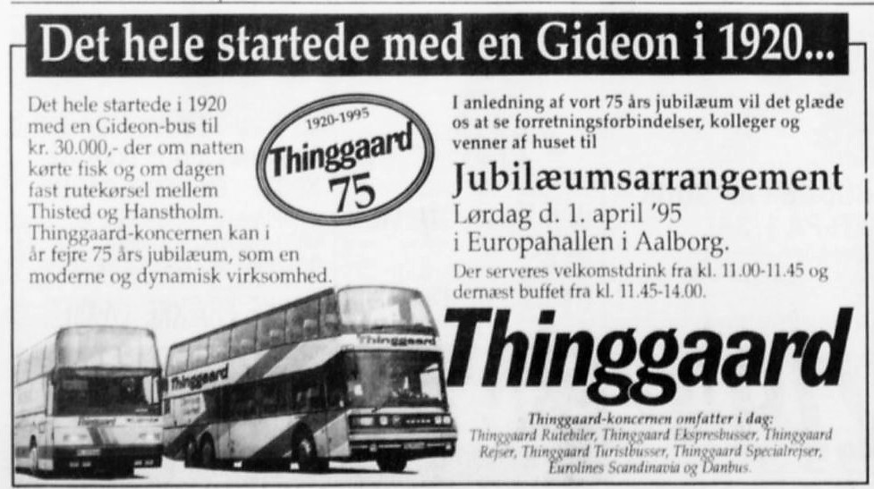 Sidst men ikke mindst var der jo transporten. Den skulle så vidt muligt ske i egne luksus busser, men da produktionen blev ’for stor’ rakte den egen vognpark ikke, og et stort antal charter busser måtte lejes for at dække behovet. Men også her sørgede Thinggaard for, at charter busserne kom så tæt på Thinggaards luksusbusser som muligt, og så kunne man jo sørge for, at de bedste af de egne busser kørte de længste ture. Det var både praktisk, bedre for kunderne og ikke mindst billigere.