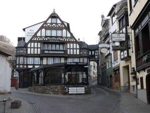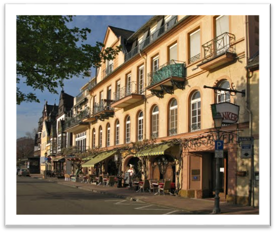 Trafikken bliver langsomt tættere og vi næsten triller gennem Rüdesheim langs vandet, og en lille historie om den røde rhinskvin som dyrkes på bjergene (Höllenberg) mellem Rüdesheim og Assmannshausen afleveres, inden vi når frem. Hotel Anker, som ligger ud mod Rhinpromenaden skal igen, lægge hus til Viking Nordturists gæster.