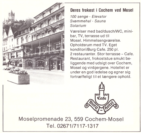 Efter frokosten er der tid på egen hånd i Cochem, og mange gæster køber lidt souvenirs til kaminhylden hjemme i Danmark. Mandtal igen ved afgangstid, og uden at efterlade gæster, går turen over Hunsrück bjergene tilbage mod Assmannshausen, hvor en lille færge bringer os over på den rigtige side af floden. Det tager kegler – sejlturen i den kraftige strøm betager altid gæsterne, så det er en glad flok som chaufføren og jeg afleverer foran hotellet.