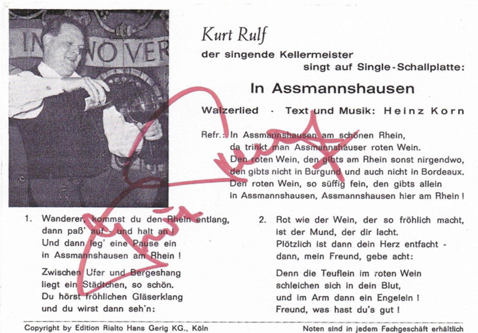 Chaufføren kører bussen væk, og senere mødes vi sammen med gæsterne til aftensmaden, og efter Hühnerbrüe, Schnitzel mit pommes und Gemüse, efterfulgt af kuchen til dessert, sætter vi i samlet flok kursen op i den lille by. Målet er Alte Bauernschänke, hvor Kurt Rulf underholder med lokale viser som ’Lorelei’, ’In Assmannshausen’ og mange flere, mens gæsterne lystigt synger med, kun afbrudt af den lokale rhinskvin og de store glas øl. Utroligt så tørstig man kan blive på turen ad de tyske motorveje.