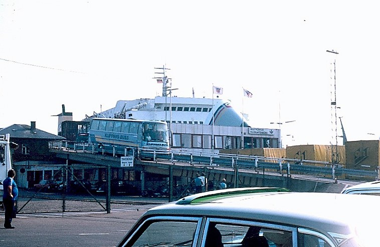 Lørdag morgen – afregningsrutine med hotellet, og chaufføren pakker denne gang bagagen, så det passer med afsætningsstederne på vejen hjemad. Derefter er der afgang, og hurtigt er vi tilbage til autobanen. Nu går jagten ind for at komme tidligt til Scandinavien Kai og til færgen som forhåbentlig er rettidig. Små 300 kilometer skal fordøjes, men heldigvis er trafikken venlig mod os. Takket være den lette trafik, bliver endnu engang tid til at besøge Rieckmanns Gasthaus i Behringen på vejen nordover. Næstsidste etape på vej hjem sættes i gang, og lidt efter klokken 13 kan vi kigge ned på færgeområdet, inden vi drejer ned mod paskontrollen og den obligatoriske vejskat kontrol. Bussens kilometertæller aflæses, og i hastigt antrit går turen endnu engang mod betalingslugerne. Papirerne skal igen tjekkes og stemples med tysk ihærdighed. Heldigvis havde vi købt det rigtige antal kilometer – men vi har jo også prøvet det før. Bussen kører ind og rundt på opmarch pladsen, mens en lille reklame for ’Den blå container’ og alle dens elektroniske herligheder udleveres, sammen med en besked om, at gæsterne skal være tilbage ved bussen når færgen ankommer. Den er slet ikke i syne – øv – en forsinkelse truer.