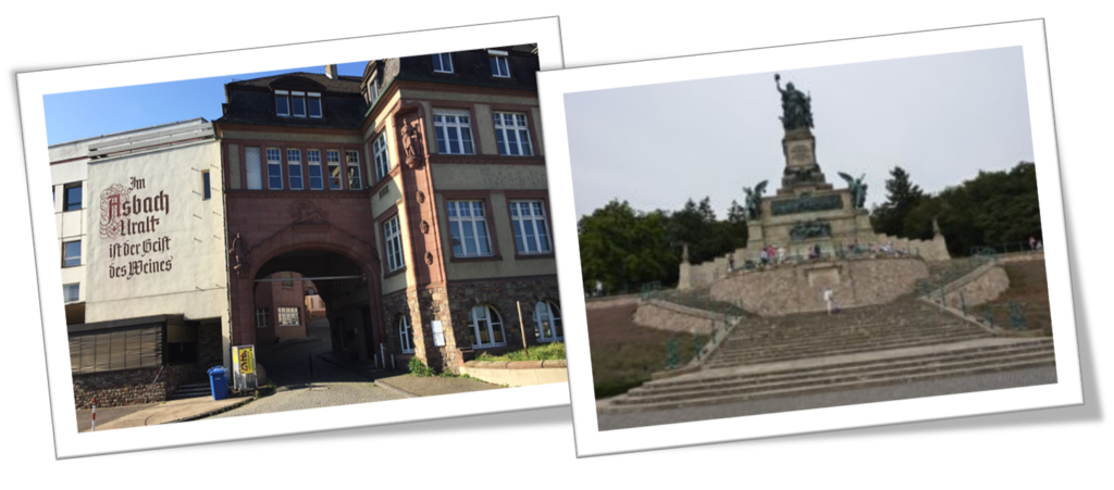 Torsdag formiddag er der igen afgang til Rüdesheim, men denne gang med historien om Asbach Uralt – Weinbrand fabrikken i lommen. Weinbrand er jo Tysklands svar på cognac, men super populær er den ikke helt hos mange danskere. På vej mod parkeringspladsen får gæsterne lige historien om ’moder Germania’ som ’pryder’ bakkerne over Rüdesheim. Gigantmonumentet hedder i virkeligheden Niederwalddenkmal og er opført til minde om etableringen af det tyske kejserrige i 1871. Selve monumentet var dog en del år undervejs, og blev først indviet i 1883. Siden har alle turisterne og ikke mindst de lokale kunnet ’nyde’ det imposante monument og dets 12,5 meter høje statue af Moder Germania. Parkering og derefter tilmelding til den bestilte rundvisning – denne gang med tysk guide. Turen går gennem fabrikken – hvor guidens fortælling løbende oversættes, og pludseligt står vi på stedet alle ventede på – prøvesmagningen ! Ved de lange borde skænker guiden op i de flade glas, og gæsterne skyller den gyldne drik ned. Enkelte rynker på næsen, af den lidt skarpe smag, men butikken sælger trods alt nogle flasker. Tilbage til bussen, og retur til frokost på hotellet.