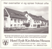 Frokosttid, skarpt højresving i afkørsel 87 bringer os væk fra autobanen og ned ad Hauptstrasse mod madoasen Hotel Eydt. Her er frokosten god, for Eydt er også indehaver af en slagterbutik. Vi modtages med åbne arme af personalet og mens gæsterne spiser frokostplatte fra Eydts egen slagter, er der en lækker Rumpsteak på tallerkenen hos os. Uhmmm – det er altid godt her.